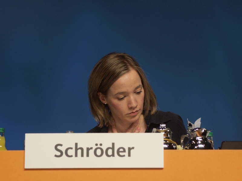 Sie glaube, dass Frauen nach der Geburt die berufsbedingte Trennung vom Kind weit schwerer falle als Männern. "Meine Erfahrung ist: Während der Schwangerschaft, der Geburt und der Stillzeit entsteht begreiflicherweise ein besonderes Näheverhältnis oder Näheverlangen zwischen Mutter und Kind." Es gebe nun einmal "bestimmte Unterschiede in den Präferenzen zwischen den Geschlechtern", die nicht veränderbar seien. Schröder begründete den eigenen Rückzug vom Amt der Familienministerin mit der mangelnden Zeit für ihre zweijährige Tochter Lotte. "Ich habe viele schöne Momente mit meiner Tochter verpasst. Oft hatte ich das Gefühl, zu wenig Zeit mit der Kleinen zu haben. Künftig möchte ich mehr von meiner Familie haben", sagte die Ministerin. Oft habe sie wegen ihres engen Terminkalenders verpasst, wenn ihre Tochter Entwicklungssprünge gemacht habe. "Das tut mir weh, und deswegen ist mir immer klarer geworden: Ich kann in meinem Leben noch viel erleben, vieles auch nachholen, aber diese besonderen Stunden mit meiner Tochter kommen nie wieder." Sie halte eine Politik für falsch, die jungen Eltern einrede, spätestes ein Jahr nach der Geburt eines Kindes "beruflich konstant Vollgas geben zu müssen, und eine durchgehende Vollzeiterwerbstätigkeit als Norm vorgibt", sagte Schröder und fügte hinzu: "Es ist ein urmenschliches Bedürfnis, in intensiven Familienphasen Zeit füreinander zu haben." Es sei falsch, Mütter zu kritisieren, die sich dafür entschieden, sich im Beruf weniger zu engagieren. "Offensichtlich tragen Frauen, die beruflich auch nur etwas kürzertreten, in Deutschland gleich den Heimchen-am-Herd-Stempel auf der Stirn", kritisierte die CDU-Politikerin.